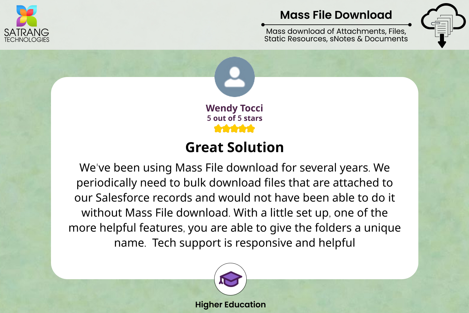 We've been using Mass File download for several years. We periodically need to bulk download files that are attached to our Salesforce records and would not have been able to do it without Mass File download. With a little set up, one of the more helpful features, you are able to give the folders a unique name. Tech support is responsive and helpful.